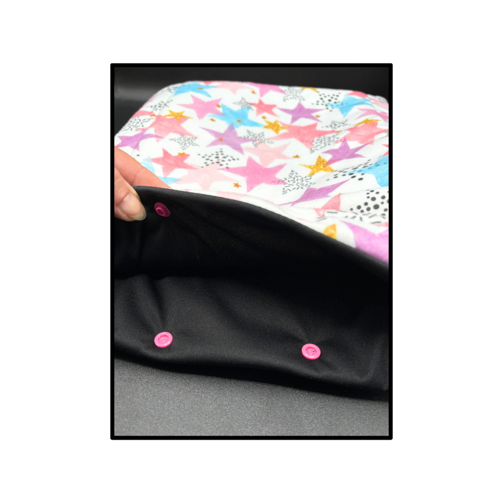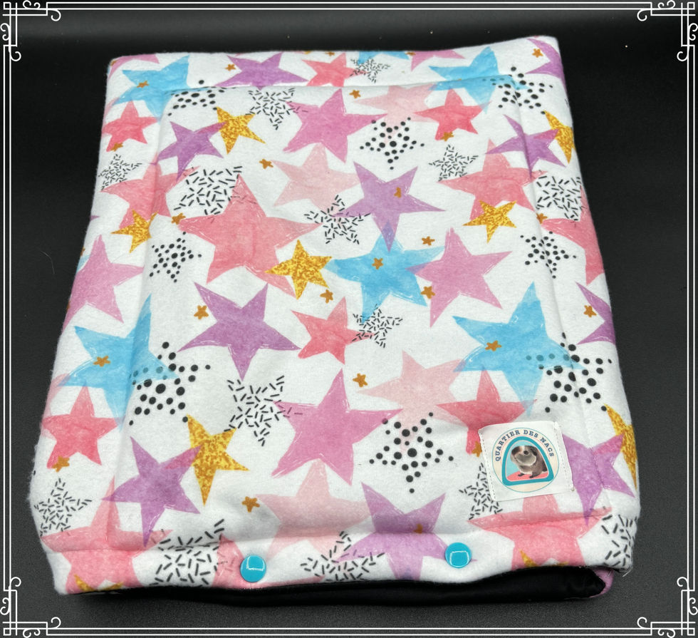 Tapis Rafraichissant Motif étoile rose et gold ;une face 100 % coton certifié Oeko-tex® Standard 100 et l'autre face polaire encre certifié Oeko-tex® Standard 100, intérieur en tissu impermeable, rembourrage ouaine épaisse, Bouton pression rose vif.
